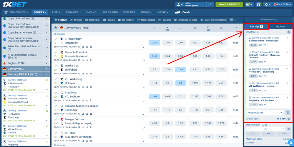 برای ثبت فرم شرط بندی در سایت 1XBET، کافی است وارد حساب کاربری خود شوید و مسابقه مورد نظر را از بخش Sports انتخاب کنید. سپس با کلیک روی ضریب دلخواه، آن گزینه به فرم شرط شما افزوده می شود. در سمت راست صفحه، فرم شرط بندی (Bet Slip) باز میشود که در آن می توانید مبلغ، نوع شرط و جزئیات دیگر را تنظیم کنید. پس از بررسی اطلاعات، تنها با یک کلیک روی دکمه Place a Bet شرط شما ثبت خواهد شد.